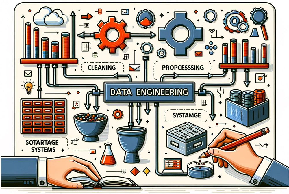 DALL¡E 3 Prompt: Create a rectangular illustration visualizing the concept of data engineering. Include elements such as raw data sources, data processing pipelines, storage systems, and refined datasets. Show how raw data is transformed through cleaning, processing, and storage to become valuable information that can be analyzed and used for decision-making.
