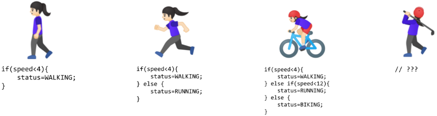 Despite their apparent simplicity, rule-based limitations become evident with complex real-world tasks. Recognizing human activities (Figure 4) illustrates this challenge: classifying movement below 4 mph as walking seems straightforward until real-world complexity emerges. Speed variations, transitions between activities, and boundary cases each demand additional rules, creating unwieldy decision trees. Computer vision tasks compound these difficulties: detecting cats requires rules about ears, whiskers, and body shapes, while accounting for viewing angles, lighting, occlusions, and natural variations. Early systems achieved success only in controlled environments with well-defined constraints.