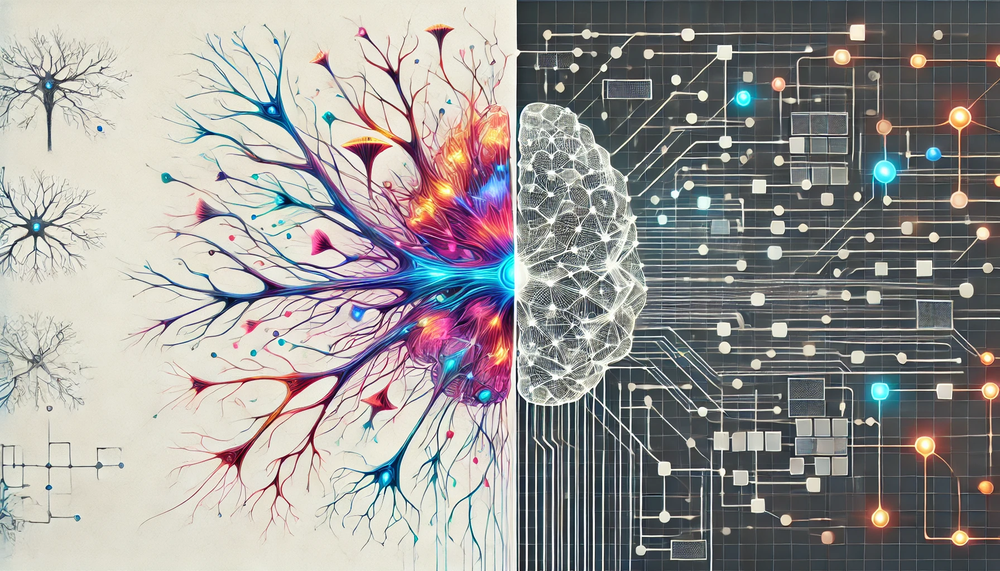 DALL¡E 3 Prompt: A rectangular illustration divided into two halves on a clean white background. The left side features a detailed and colorful depiction of a biological neural network, showing interconnected neurons with glowing synapses and dendrites. The right side displays a sleek and modern artificial neural network, represented by a grid of interconnected nodes and edges resembling a digital circuit. The transition between the two sides is distinct but harmonious, with each half clearly illustrating its respective theme: biological on the left and artificial on the right.