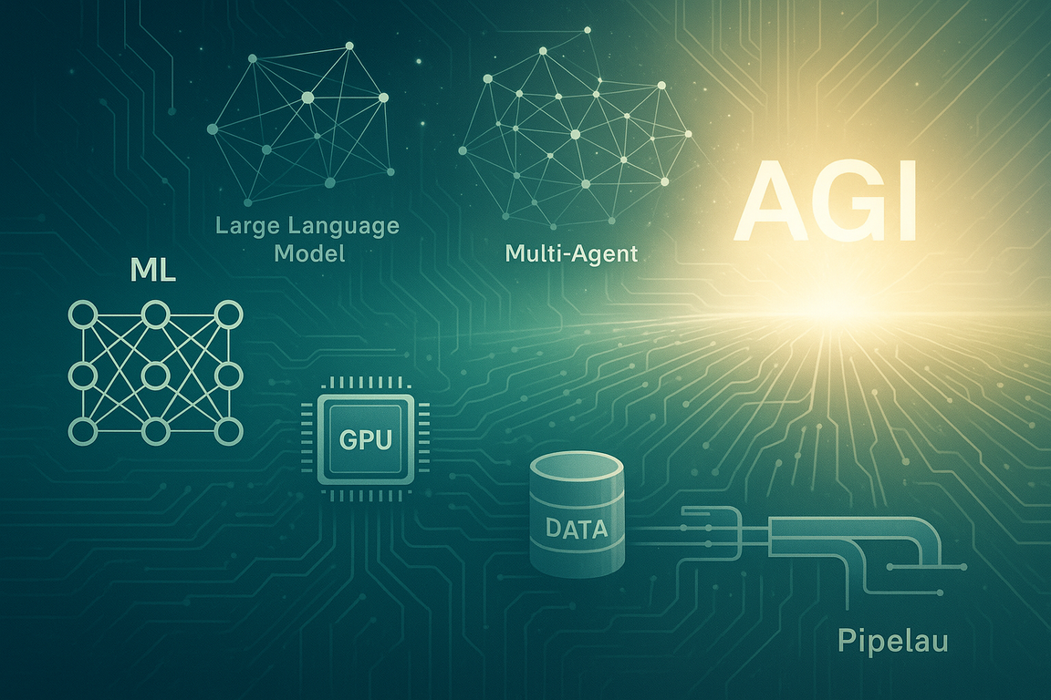 DALL·E 3 Prompt: A futuristic visualization showing the evolution from current ML systems to AGI. The image depicts a technical visualization with three distinct zones: in the foreground, familiar ML components like neural networks, GPUs, and data pipelines; in the middle ground, emerging systems like large language models and multi-agent architectures forming interconnected constellations; and in the background, a luminous horizon suggesting AGI. The scene uses a gradient from concrete technical blues and greens in the foreground to abstract golden and white light at the horizon. Circuit patterns and data flows connect all elements, showing how today’s building blocks evolve into tomorrow’s intelligence. The style is technical yet aspirational, suitable for an advanced textbook.