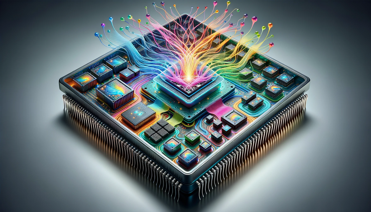 DALL·E 3 Prompt: Create an intricate and colorful representation of a System on Chip (SoC) design in a rectangular format. Showcase a variety of specialized machine learning accelerators and chiplets, all integrated into the processor. Provide a detailed view inside the chip, highlighting the rapid movement of electrons. Each accelerator and chiplet should be designed to interact with neural network neurons, layers, and activations, emphasizing their processing speed. Depict the neural networks as a network of interconnected nodes, with vibrant data streams flowing between the accelerator pieces, showcasing the enhanced computation speed.