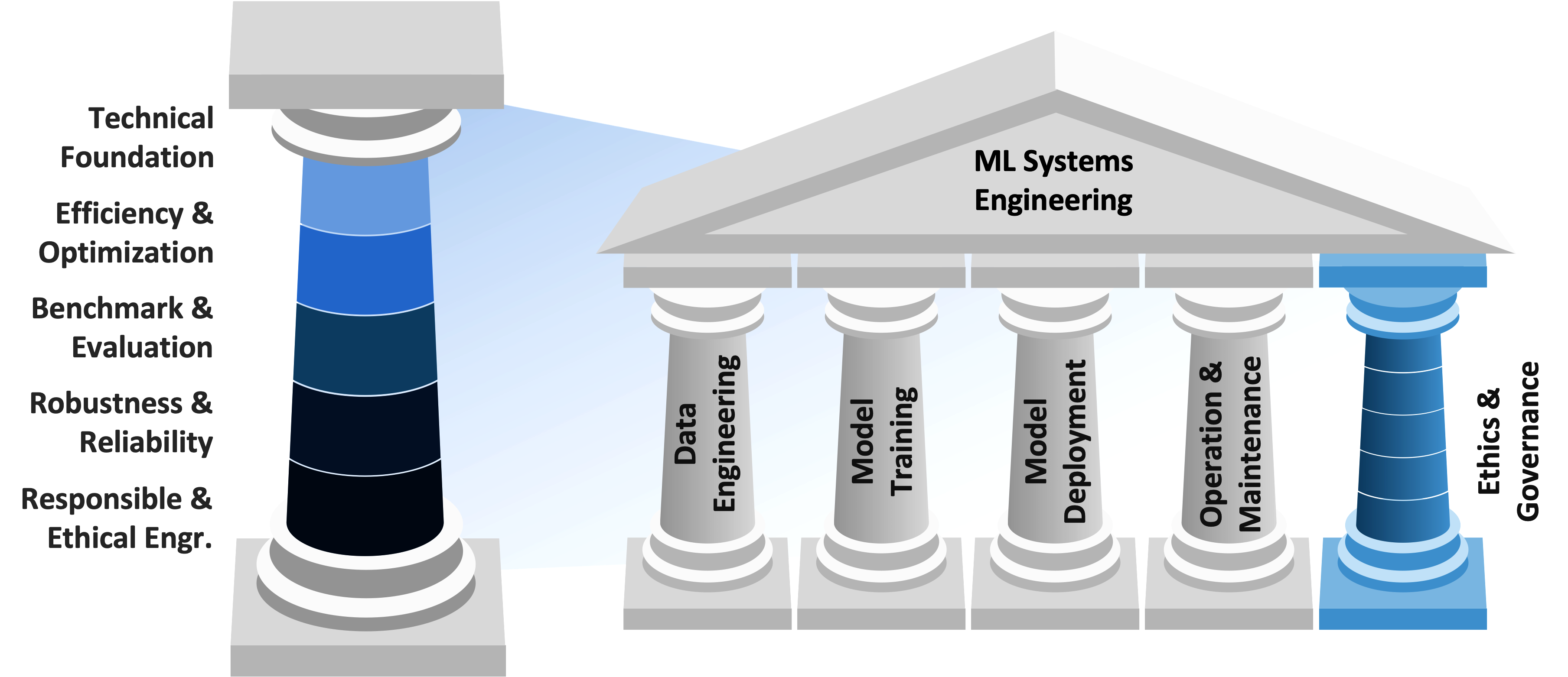 This structure reflects how AI evolved from algorithm-centric research to systems-centric engineering, shifting focus from âcan we make this algorithm work?â to âcan we build systems that reliably deploy, operate, and maintain these algorithms at scale?â The five pillars represent the engineering capabilities required to answer âyes.â
