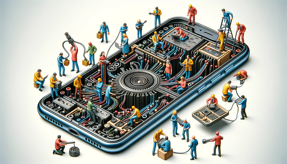 DALLĀ·E 3 Prompt: Drawing of a smartphone with its internal components exposed, revealing diverse miniature engineers of different genders and skin tones actively working on the ML model. The engineers, including men, women, and non-binary individuals, are tuning parameters, repairing connections, and enhancing the network on the fly. Data flows into the ML model, being processed in real-time, and generating output inferences.
