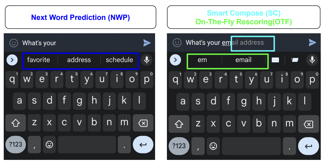 As shown in Figure 2, different prediction strategies illustrate how local adaptation operates in real time: next-word prediction (NWP) suggests likely continuations based on prior text, while Smart Compose uses on-the-fly rescoring to offer dynamic completions, demonstrating the sophistication of local inference mechanisms.