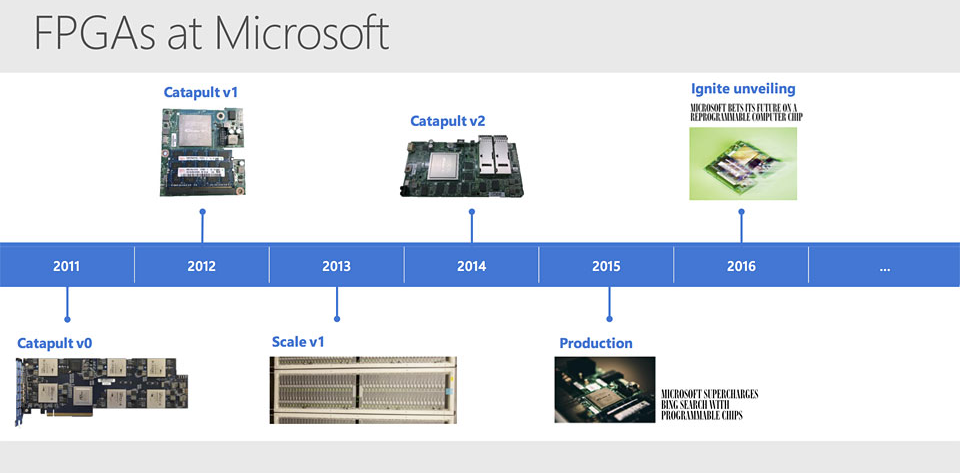 42 Microsoft FPGA Deployment: Project Catapult deployed FPGAs across Microsoftâs entire datacenter fleet by 2016, with one FPGA per server (>1 million total). This $1 billion investment improved Bing search latency by 50% and Azure ML inference by 2x, while reducing power consumption by 10-15% through specialized acceleration of specific algorithms.