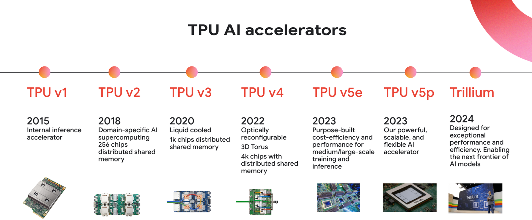 As illustrated in Figure 20, TPUs have undergone significant architectural evolution, with each generation introducing enhancements tailored for increasingly demanding AI workloads. The first-generation TPU, introduced in 2015, was designed for internal inference acceleration. Subsequent iterations have focused on large-scale distributed training, memory optimizations, and efficiency improvements, culminating in the most recent Trillium architecture. These advancements illustrate how domain-specific accelerators continue to push the boundaries of AI performance and efficiency.