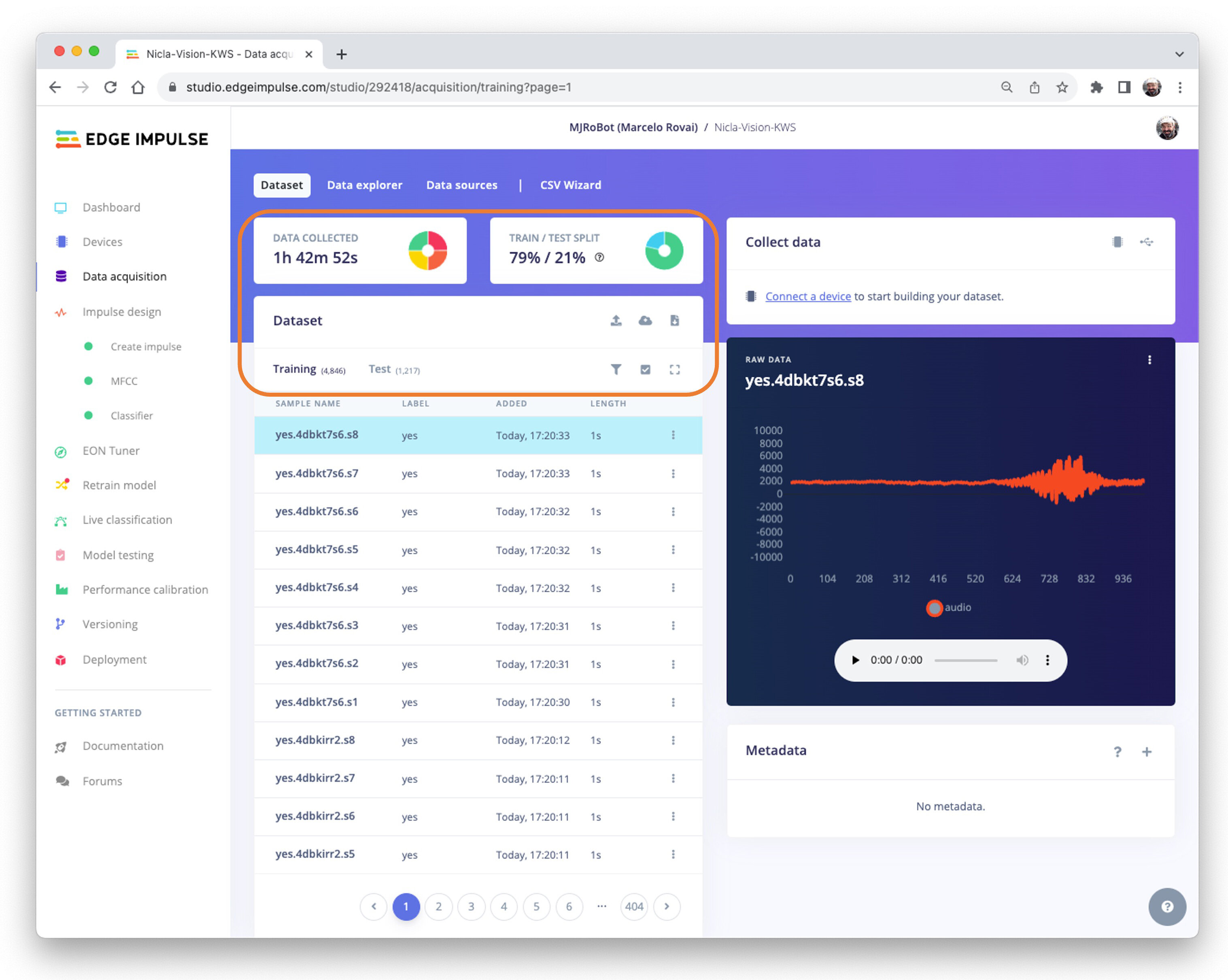 The dataset will now appear in the Data acquisition section. Note that the approximately 6,000 samples (1,500 for each class) are split into Train (4,800) and Test (1,200) sets.