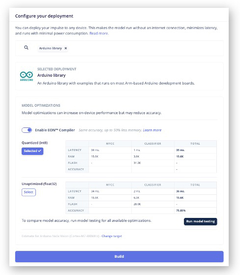 The EIS will package all the needed libraries, preprocessing functions, and trained models, downloading them to your computer. Go to the Deployment section, select Arduino Library, and at the bottom, choose Quantized (Int8) and press Build.