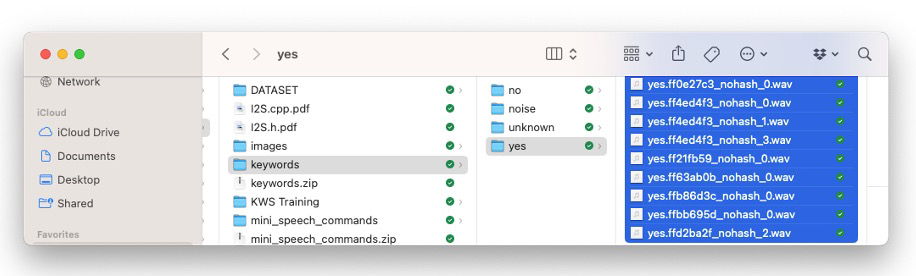 The critical component of any Machine Learning Workflow is the dataset. Once we have decided on specific keywords, in our case (YES and NO), we can take advantage of the dataset developed by Pete Warden, âSpeech Commands: A Dataset for Limited-Vocabulary Speech Recognition.â This dataset has 35 keywords (with +1,000 samples each), such as yes, no, stop, and go. In words such as yes and no, we can get 1,500 samples.