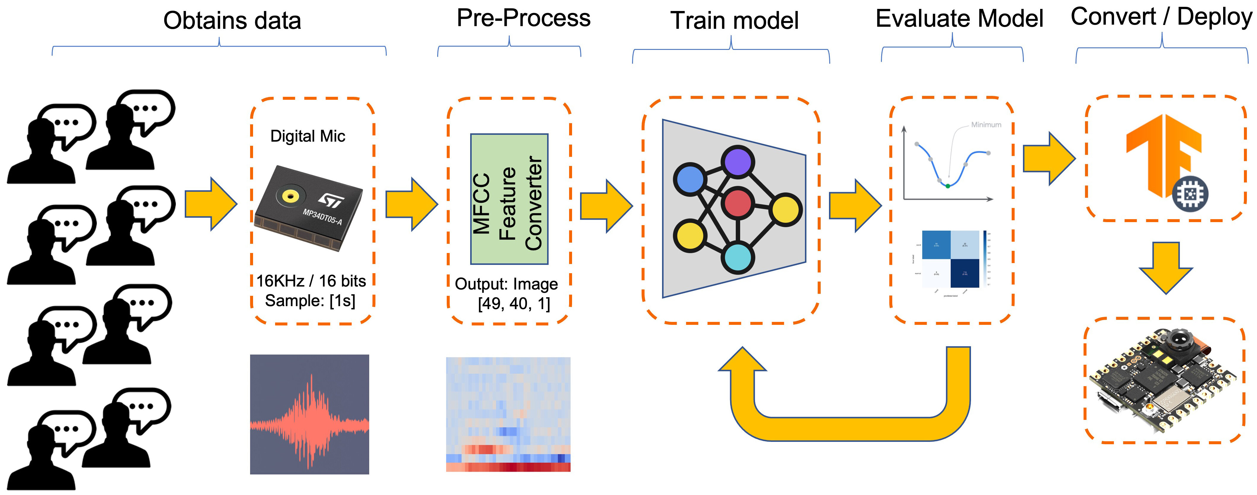 The main component of the KWS application is its model. So, we must train such a model with our specific keywords, noise, and other words (the âunknownâ):