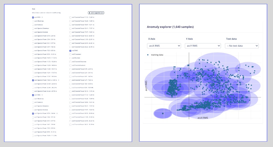 For Anomaly Detection, we will choose the suggested features that are precisely the most important ones in the Feature Extraction, plus the accZ RMS. The number of clusters will be [32], as suggested by the Studio: