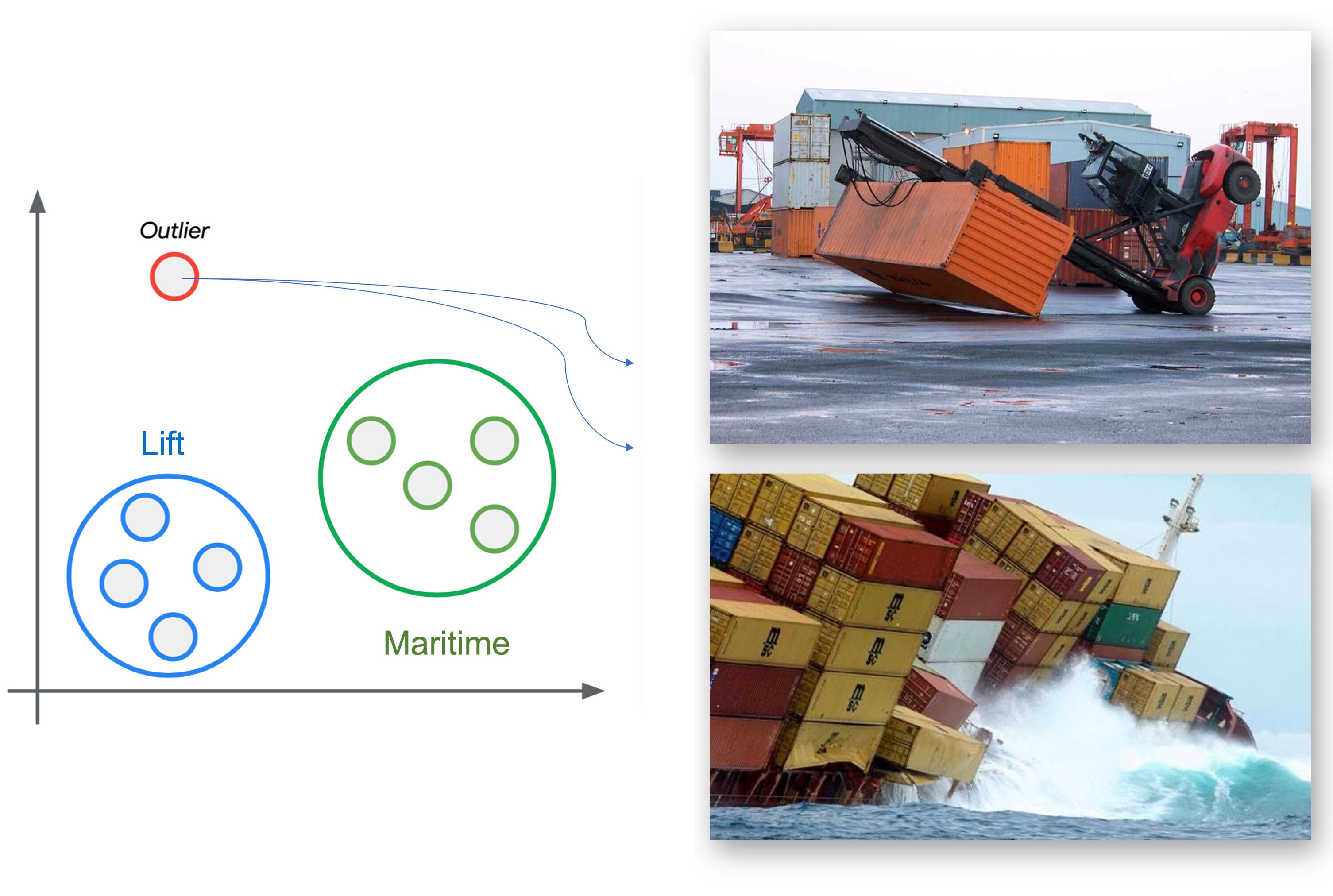 This second model uses a K-means model. If we imagine that we could have our known classes as clusters, any sample that could not fit on that could be an outlier, an anomaly such as a container rolling out of a ship on the ocean or falling from a Forklift.