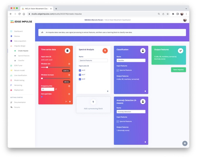 On the Studio, the collected raw dataset will be the input of a Spectral Analysis block, which is excellent for analyzing repetitive motion, such as data from accelerometers. This block will perform a DSP (Digital Signal Processing), extracting features such as FFT or Wavelets.