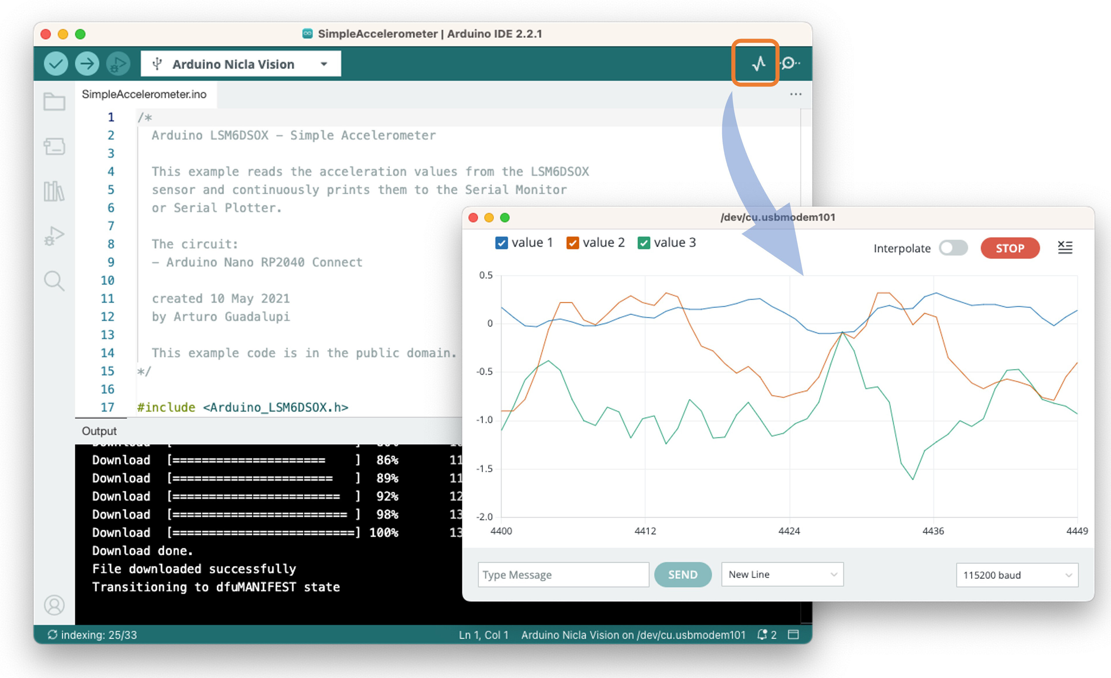 You can now upload the code to your device and proceed with the inferences. Press the Nicla [RESET] button twice to put it on boot mode (disconnect from the Studio if it is still connected), and upload the sketch to your board.