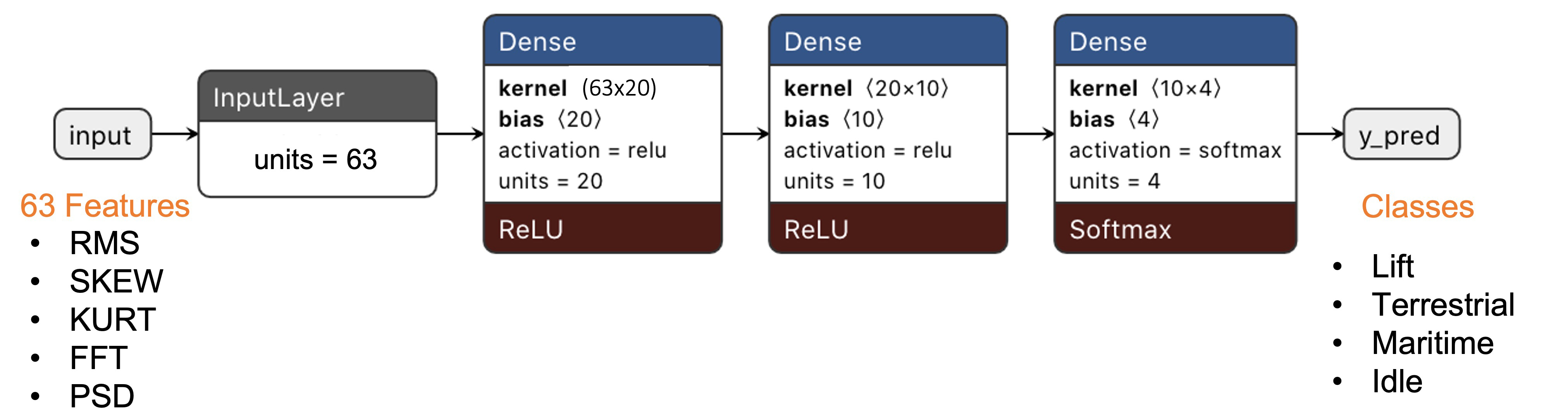 Our classifier will be a Dense Neural Network (DNN) that will have 63 neurons on its input layer, two hidden layers with 20 and 10 neurons, and an output layer with four neurons (one per each class), as shown here: