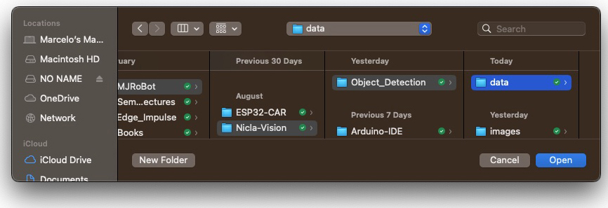 First, we create a folder on the computer where the data will be saved, for example, “data.” Next, on the OpenMV IDE, we go to Tools > Dataset Editor and select New Dataset to start the dataset collection: