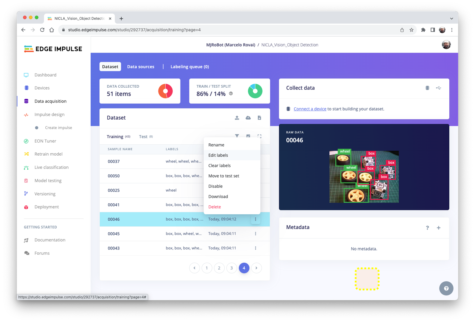 Next, review the labeled samples on the Data acquisition tab. If one of the labels is wrong, it can be edited using the three dots menu after the sample name: