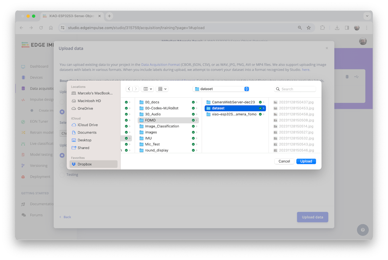 On Studio, go to the Data acquisition tab, and on the UPLOAD DATA section, upload files captured as a folder from your computer.