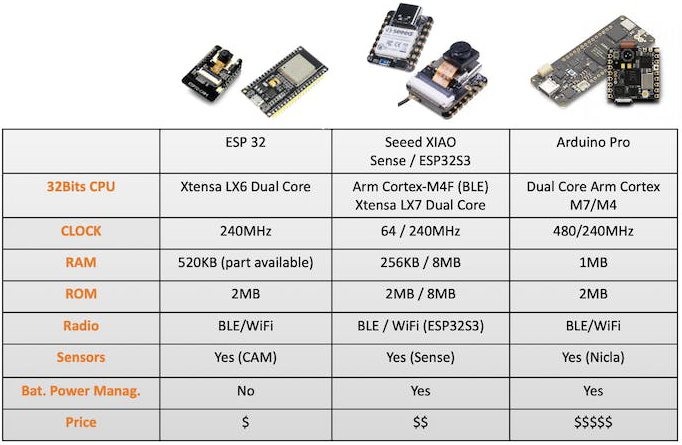 Several development boards can be used for embedded machine learning (TinyML), and the most common ones for Computer Vision applications (consuming low energy), are the ESP32 CAM, the Seeed XIAO ESP32S3 Sense, the Arduino Nicla Vison, and the Arduino Portenta.