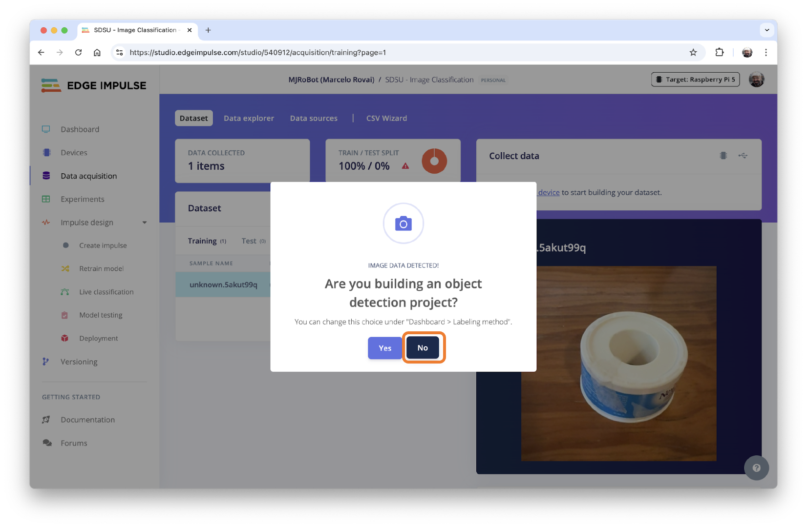 Note that when you start to upload the data, a pop-up window can appear, asking if you are building an Object Detection project. Select [NO].