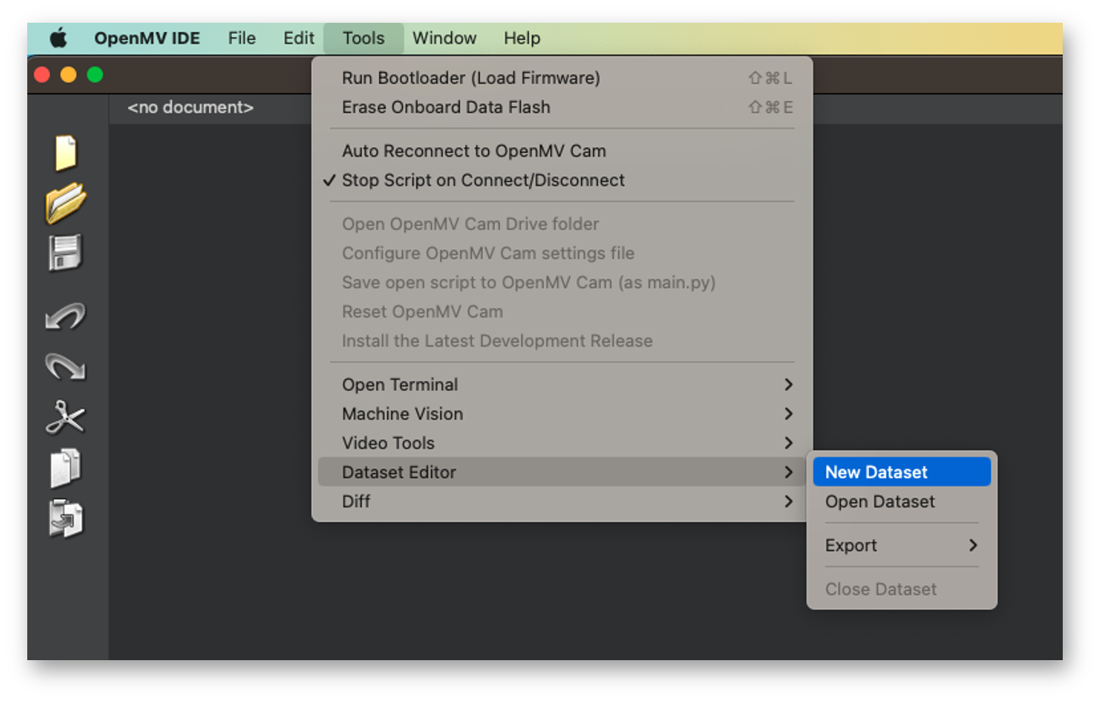 First, we should create a folder on our computer where the data will be saved, for example, “data.” Next, on the OpenMV IDE, we go to Tools > Dataset Editor and select New Dataset to start the dataset collection:
