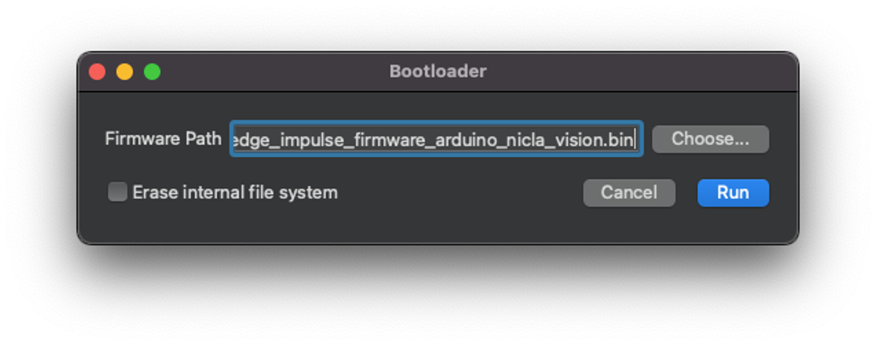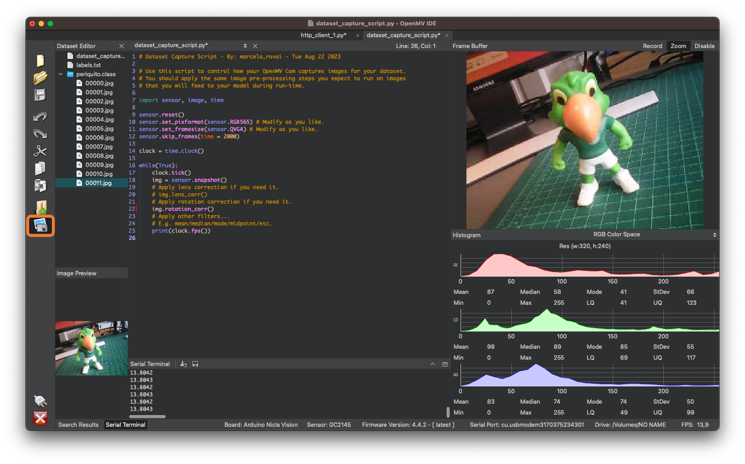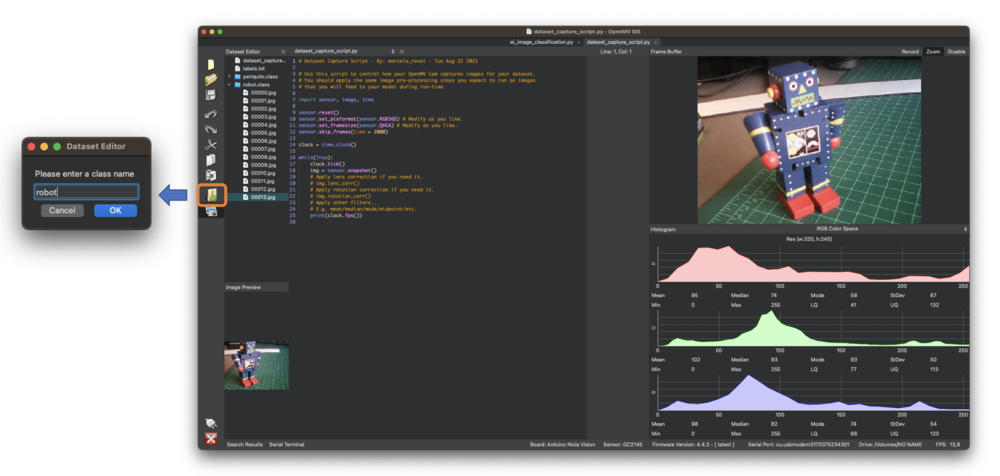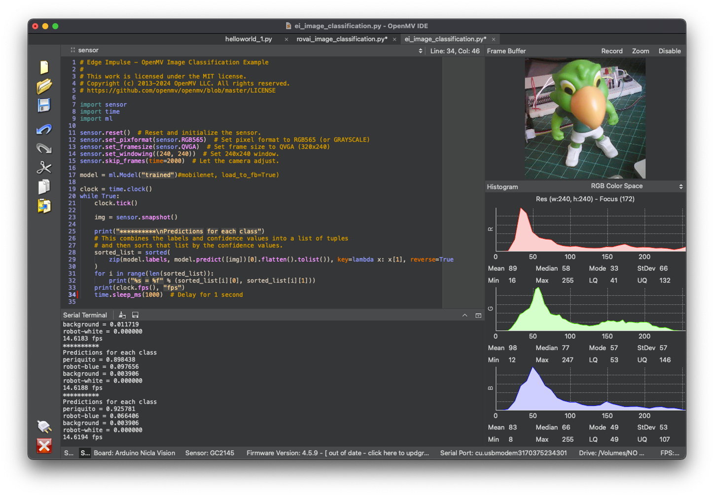 Now, open the script ei_image_classification.py that was downloaded from the Studio and the.bin file for the Nicla.