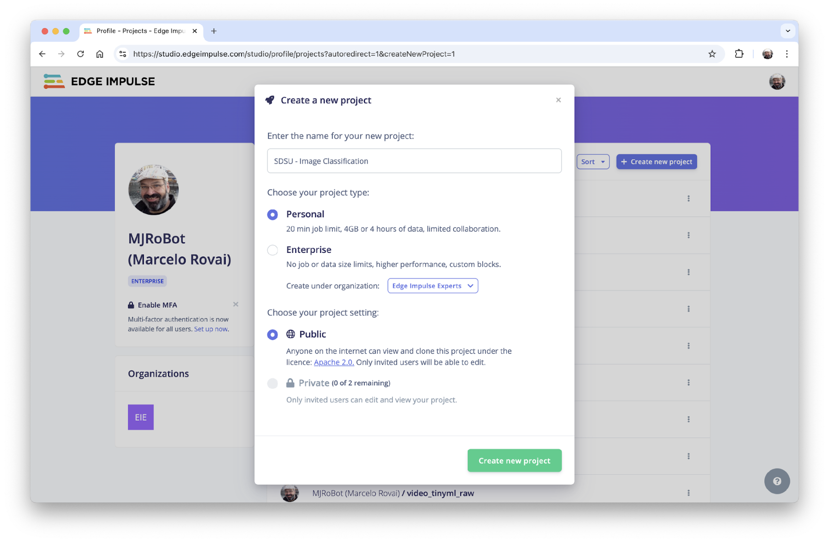 We will use the Edge Impulse Studio to train our model. Enter the account credentials and create a new project: