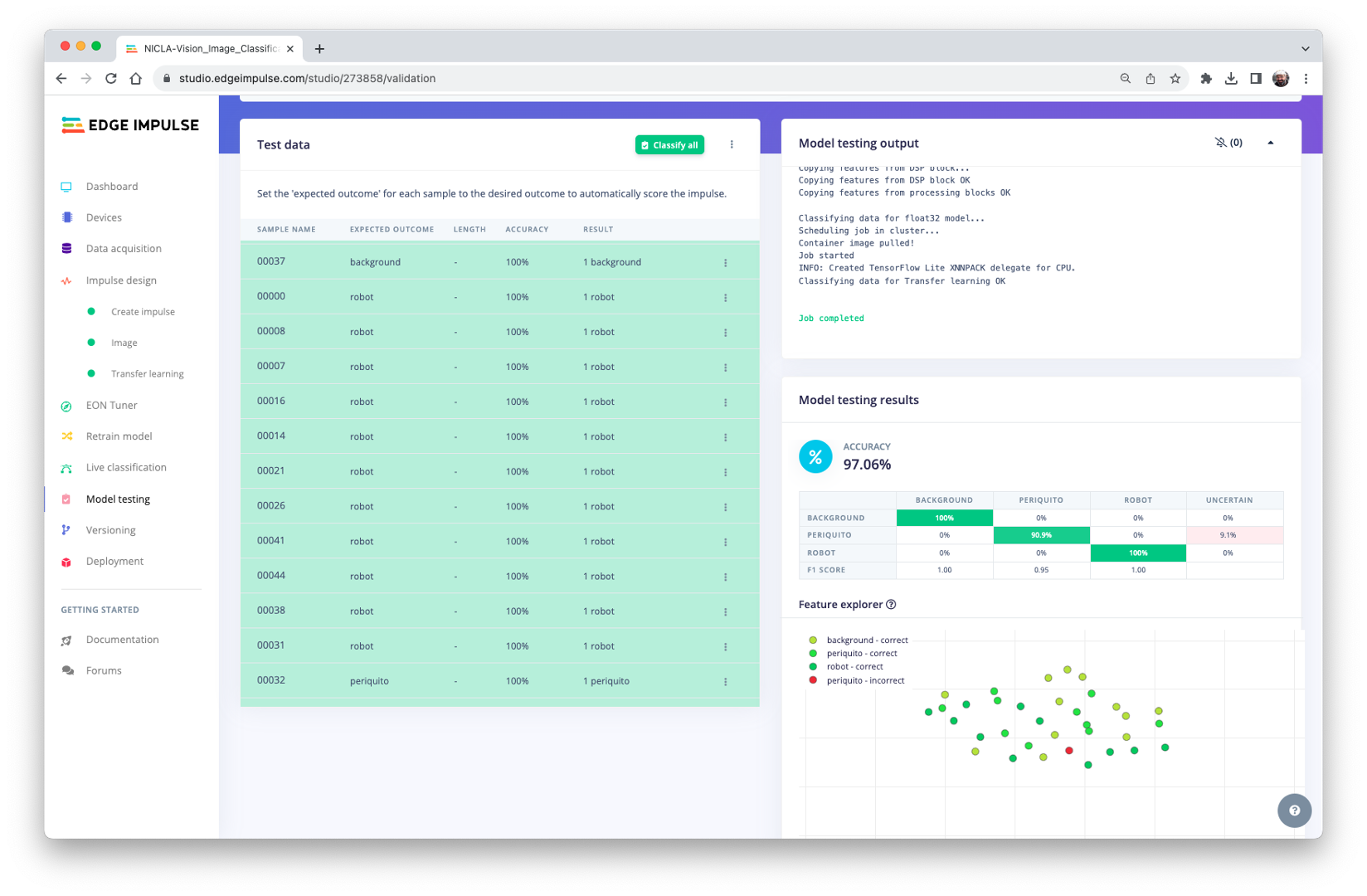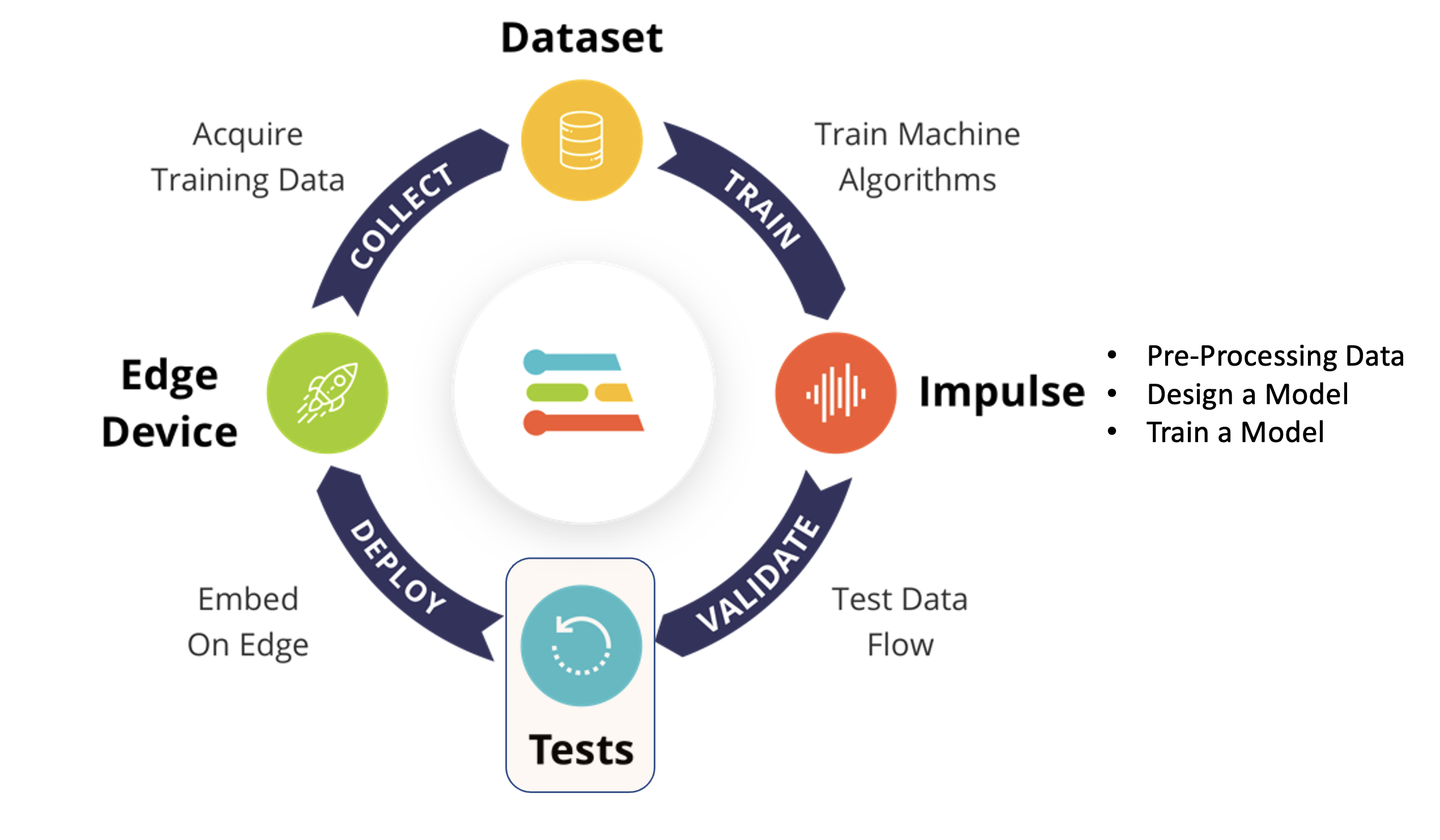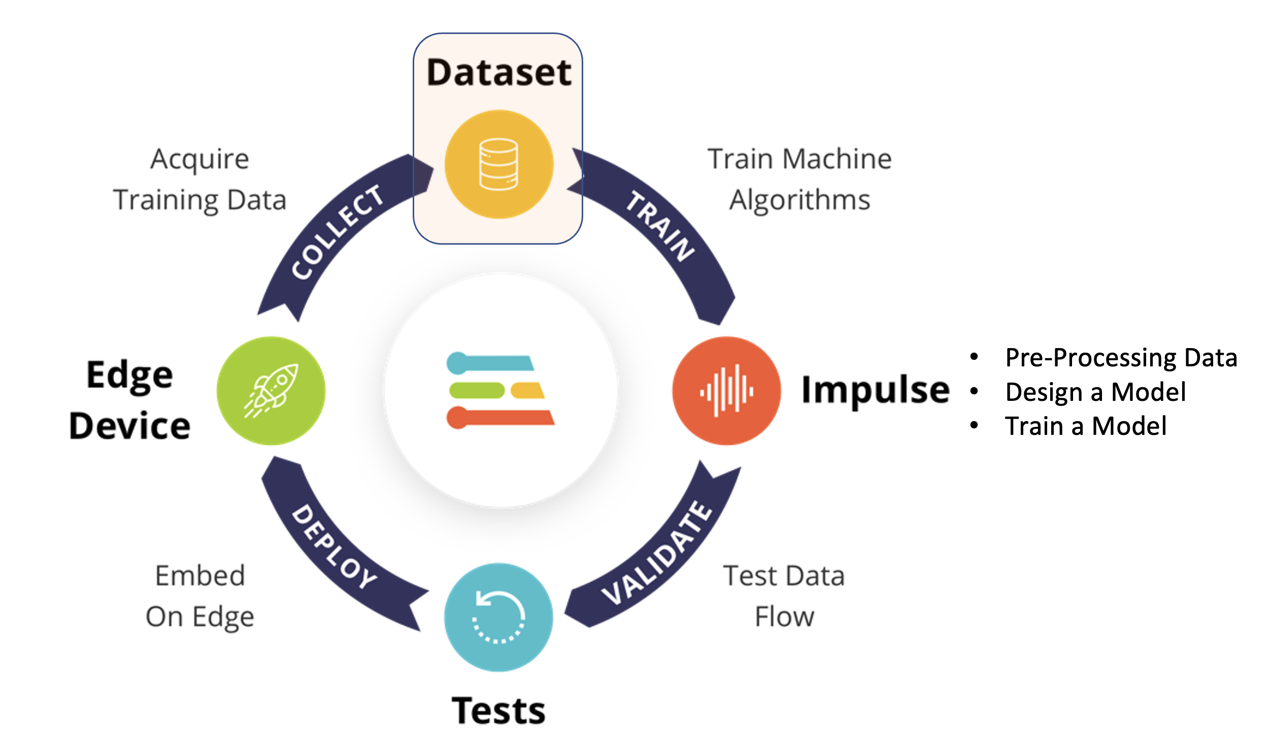 Using the EI Studio (or Studio), we will go over four main steps to have our model ready for use on the Nicla Vision board: Dataset, Impulse, Tests, and Deploy (on the Edge Device, in this case, the NiclaV).
