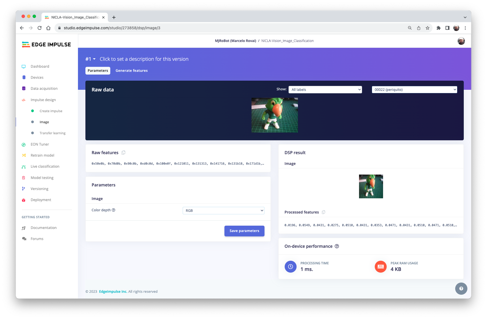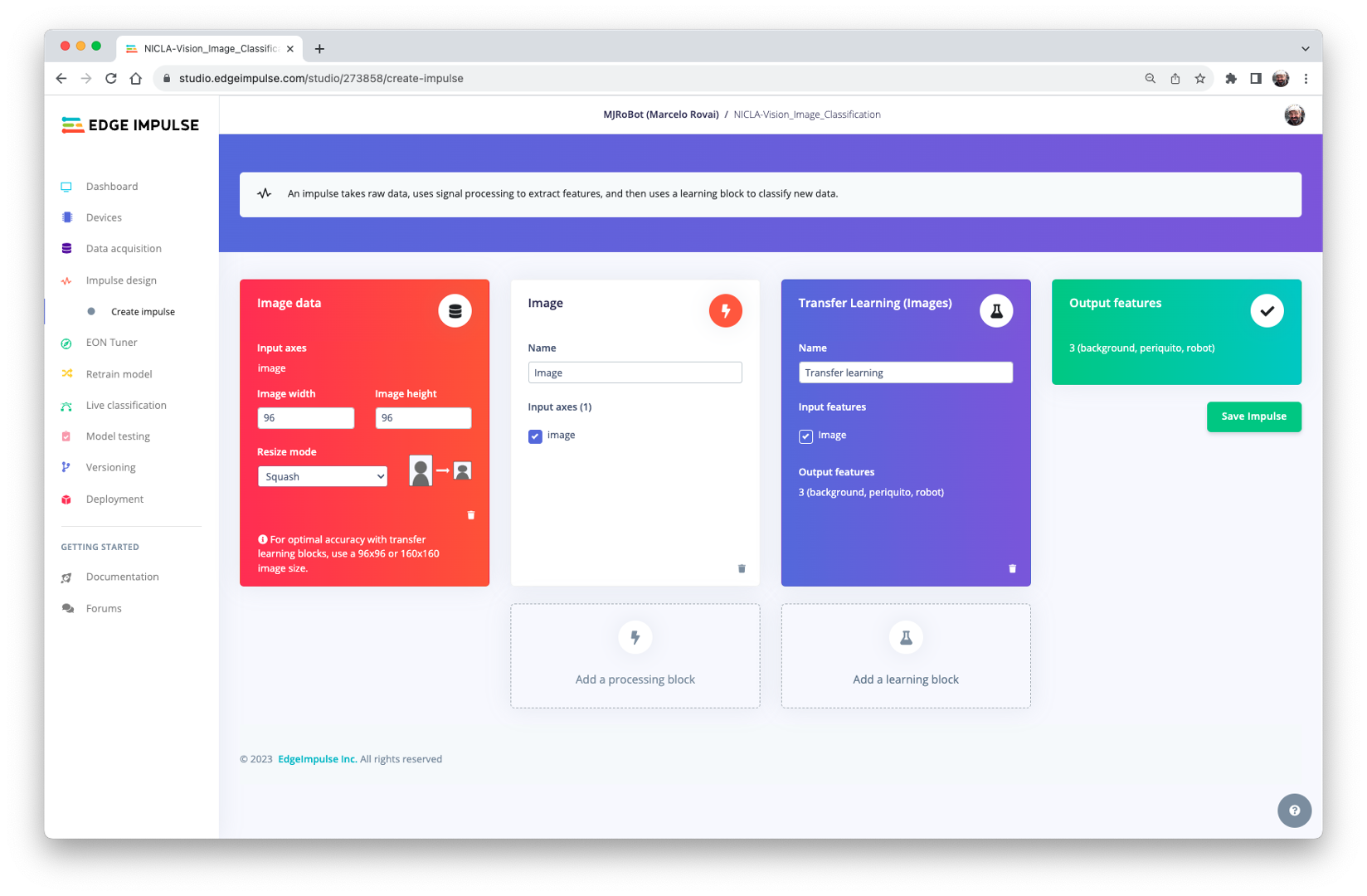 Go to the Impulse Design Tab and create the impulse, defining an image size of 96x96 and squashing them (squared form, without cropping). Select Image and Transfer Learning blocks. Save the Impulse.
