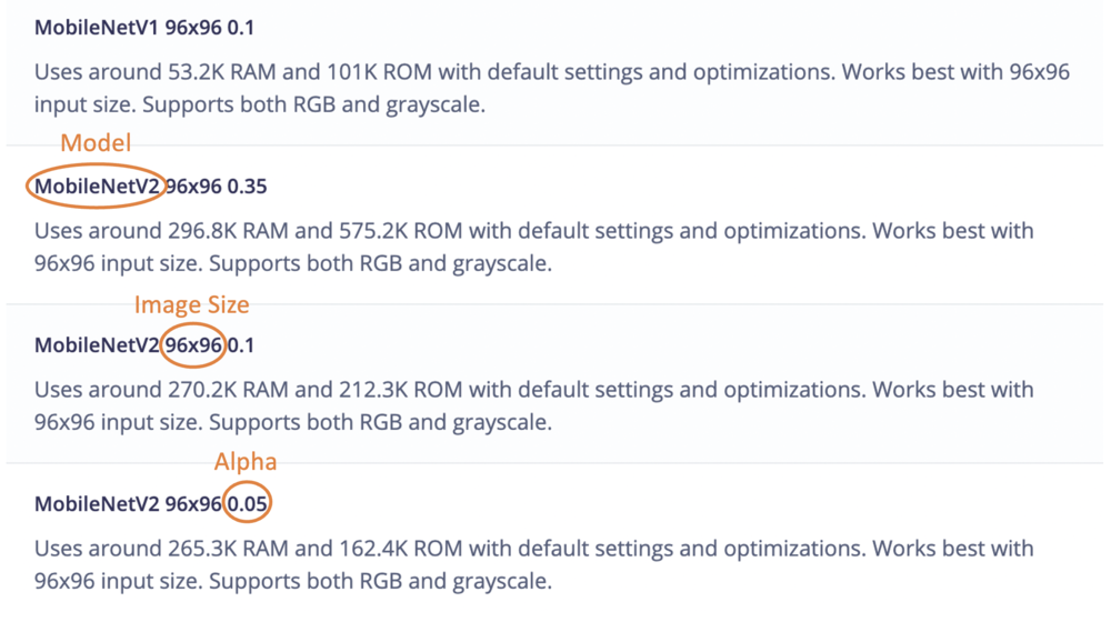Edge Impulse Studio can use both MobileNetV1 (\(96\times 96\) images) and V2 (\(96\times 96\) or \(160\times 160\) images), with several different \(\alpha\) values (from 0.05 to 1.0). For example, you will get the highest accuracy with V2, \(160\times 160\) images, and \(\alpha=1.0\). Of course, there is a trade-off. The higher the accuracy, the more memory (around 1.3 MB RAM and 2.6 MB ROM) will be needed to run the model, implying more latency. The smaller footprint will be obtained at the other extreme with MobileNetV1 and \(\alpha=0.10\) (around 53.2 K RAM and 101 K ROM).