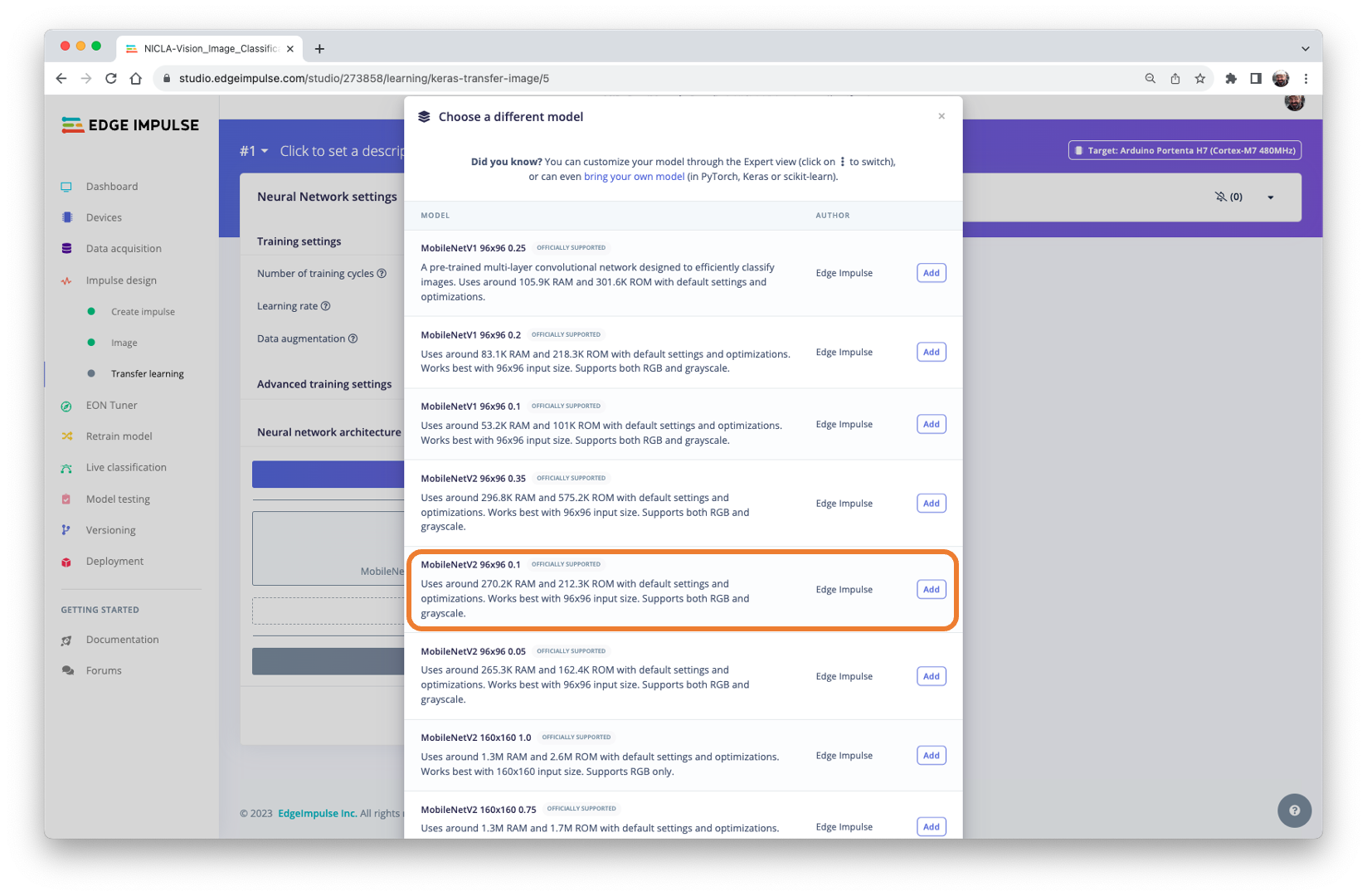 We will use MobileNetV2 96x96 0.1 ( or 0.05) for this project, with an estimated memory cost of 265.3 KB in RAM. This model should be OK for the Nicla Vision with 1MB of SRAM. On the Transfer Learning Tab, select this model: