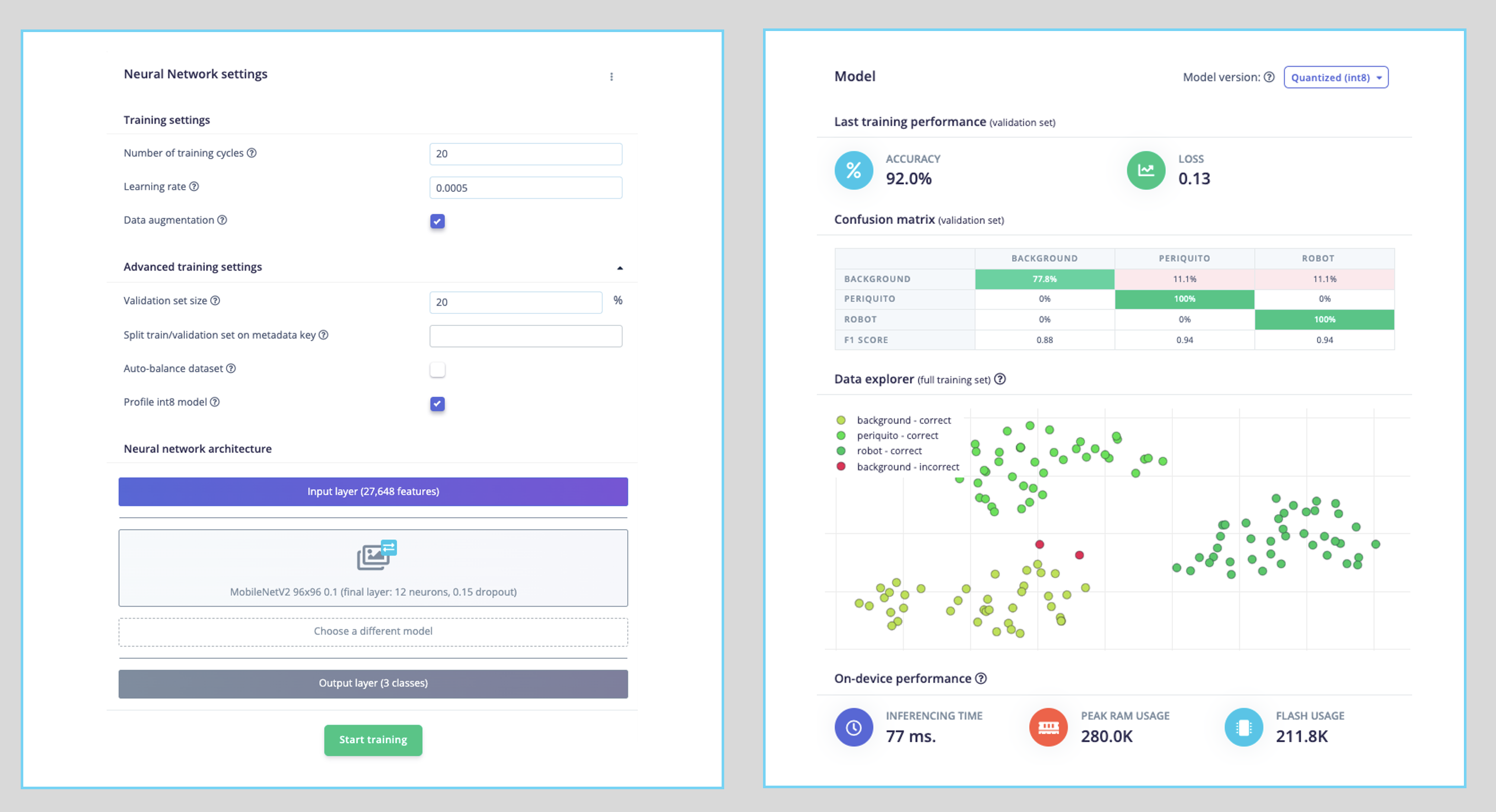 Transfer Learning (Images)to fine-tune a pre-trained MobileNet V2 image classification model on our data. This method performs well even with relatively small image datasets (around 150 images in our case).