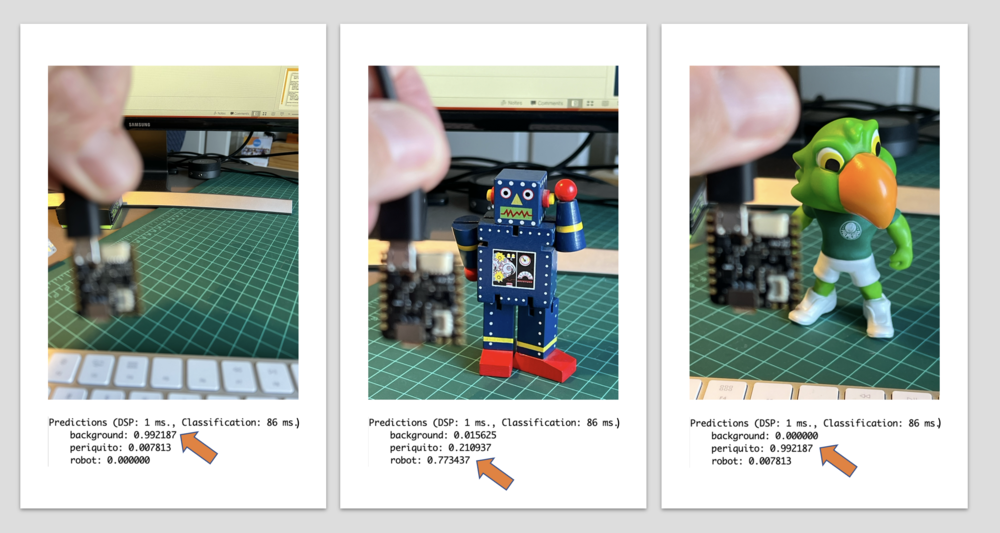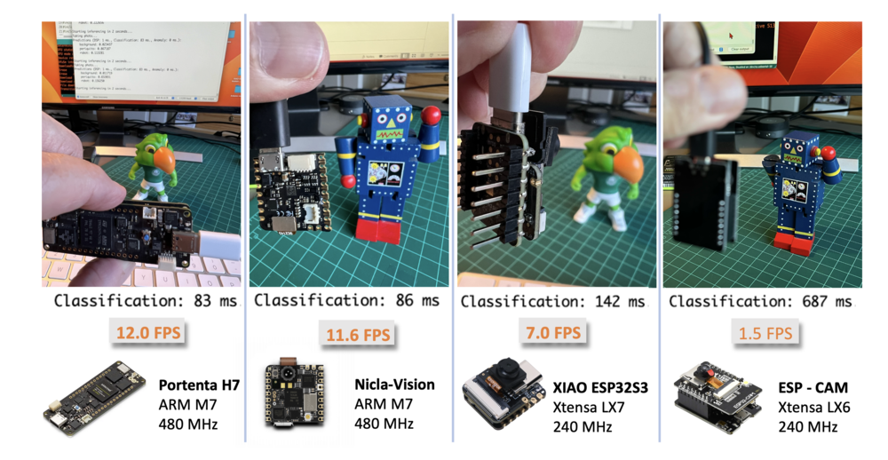 Catching the opportunity, the same trained model was deployed on the ESP-CAM, the XIAO, and the Portenta (in this one, the model was trained again, using grayscaled images to be compatible with its camera). Here is the result, deploying the models as Arduino’s Library: