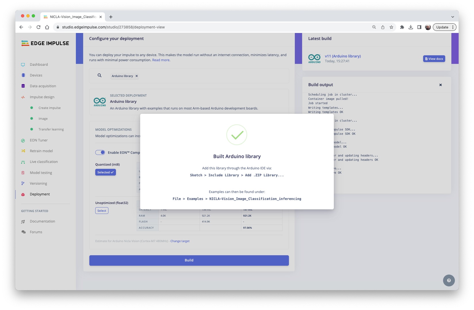 It is possible to deploy the trained model to be used with OpenMV in two ways: as a library and as a firmware (FW). Choosing FW, the Edge Impulse Studio generates optimized models, libraries, and frameworks needed to make the inference. Let’s explore this option.
