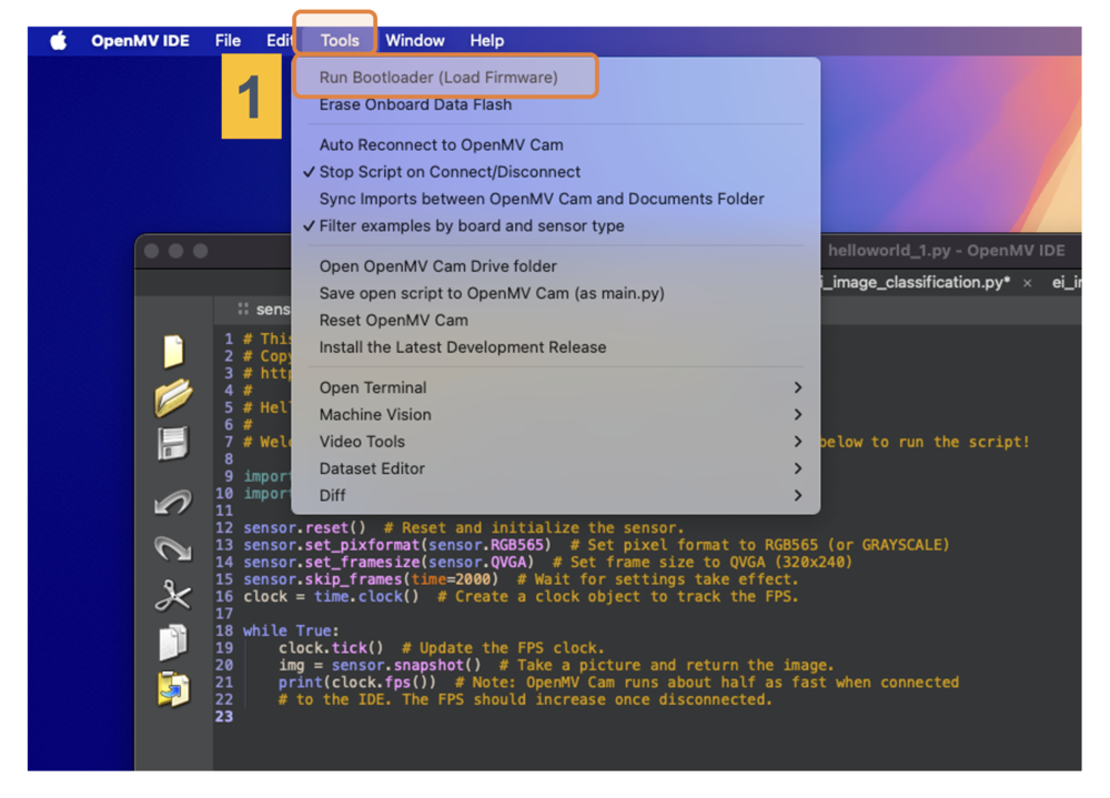 Use the Bootloader tool on the OpenMV IDE to load the FW on your board (1):