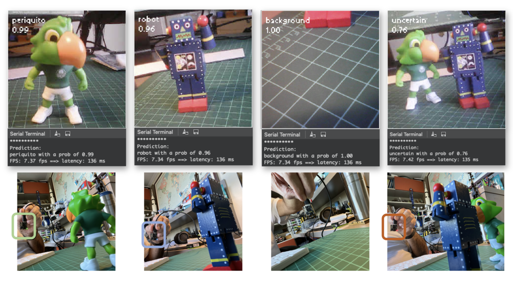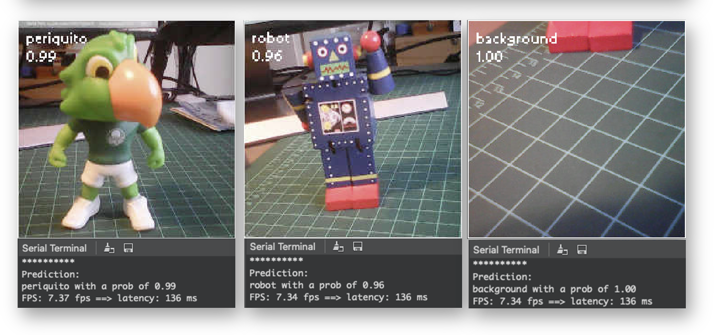 Run it. Pointing the camera to the objects we want to classify, the inference result will be displayed on the Serial Terminal.