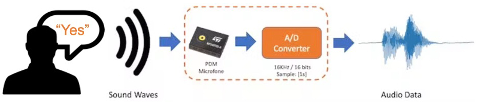 When we pronounce a keyword, the sound waves should be converted to audio data. The conversion should be done by sampling the signal generated by the microphone at a 16 KHz frequency with 16-bit per sample amplitude.