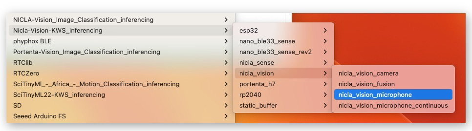 In your Arduino IDE, go to the File/Examples tab, look for your project, and select nicla-vision/nicla-vision_microphone (or nicla-vision_microphone_continuous)