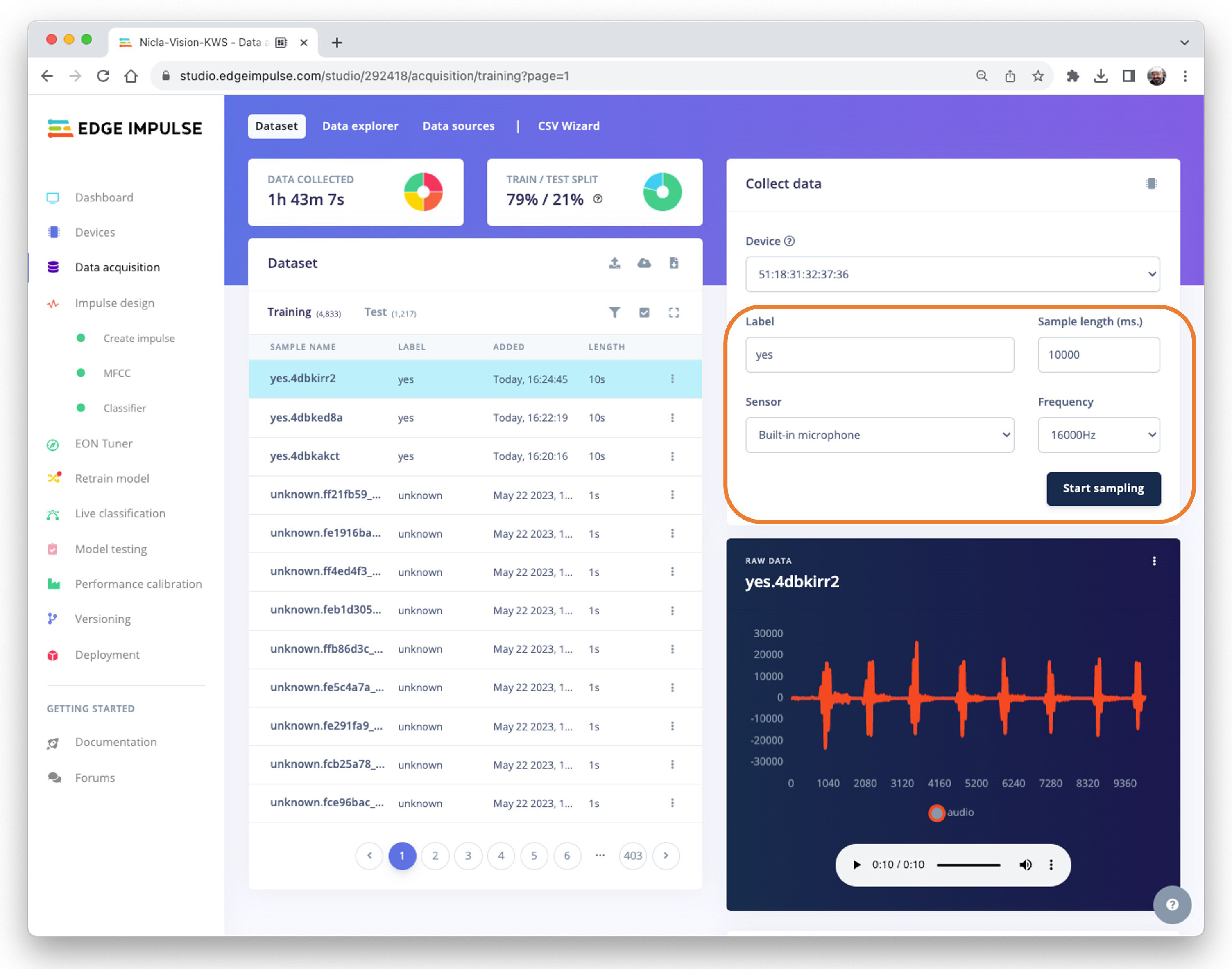 You can choose which sensor data to pick in the Collect Data section on the Data Acquisition tab. Select: Built-in microphone, define your label (for example, yes), the sampling Frequency[16000Hz], and the Sample length (in milliseconds), for example [10s]. Start sampling.