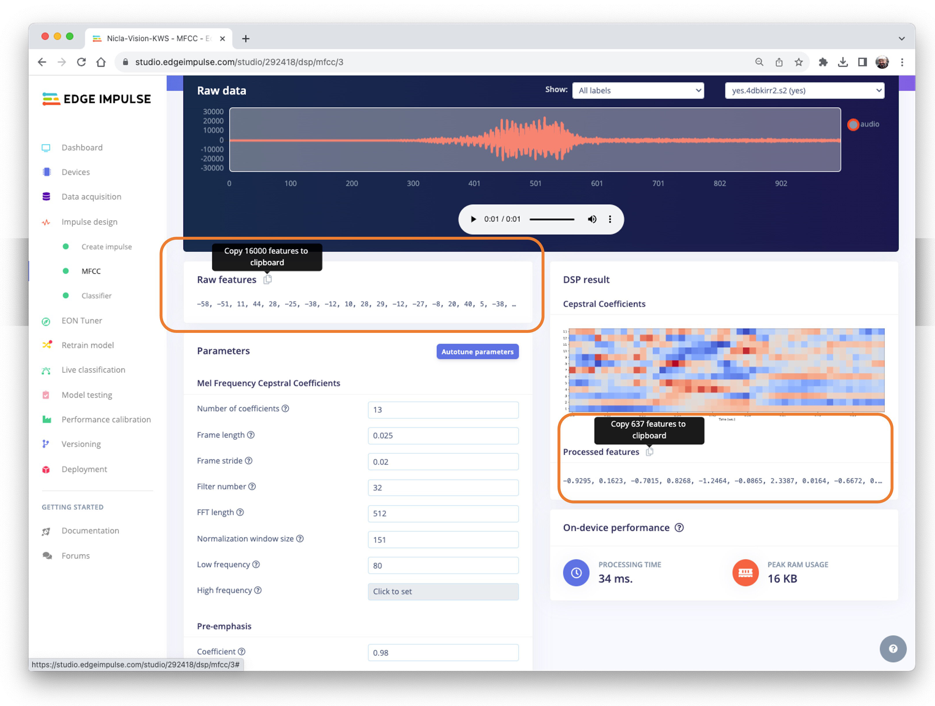 The result shows that we only used a small amount of memory to pre-process data (16 KB) and a latency of 34 ms, which is excellent. For example, on an Arduino Nano (Cortex-M4f @ 64 MHz), the same pre-process will take around 480 ms. The parameters chosen, such as the FFT length [512], will significantly impact the latency.