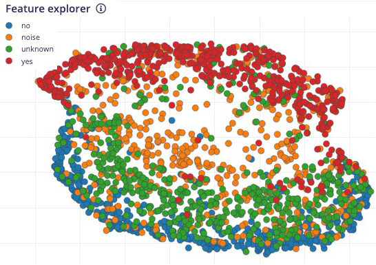 Now, let’s Save parameters and move to the Generated features tab, where the actual features will be generated. Using UMAP, a dimension reduction technique, the Feature explorer shows how the features are distributed on a two-dimensional plot.