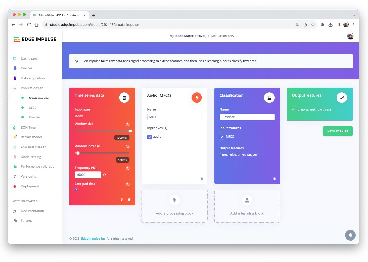 An impulse takes raw data, uses signal processing to extract features, and then uses a learning block to classify new data.