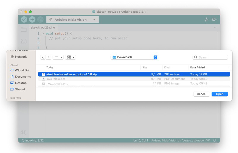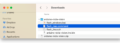 Upload the binary arduino-nicla-vision.bin to your board by running the batch code corresponding to your OS.