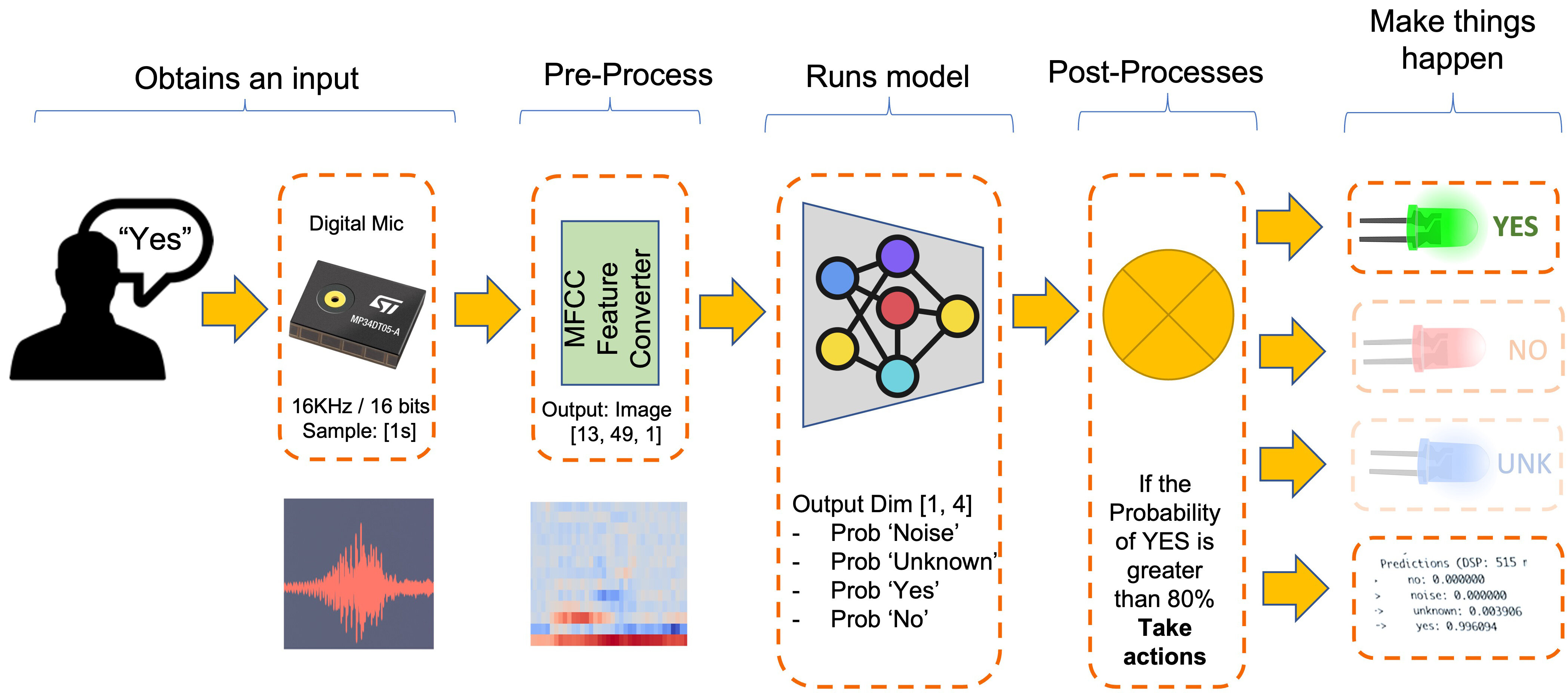 The diagram below gives an idea of how the final KWS application should work (during inference):