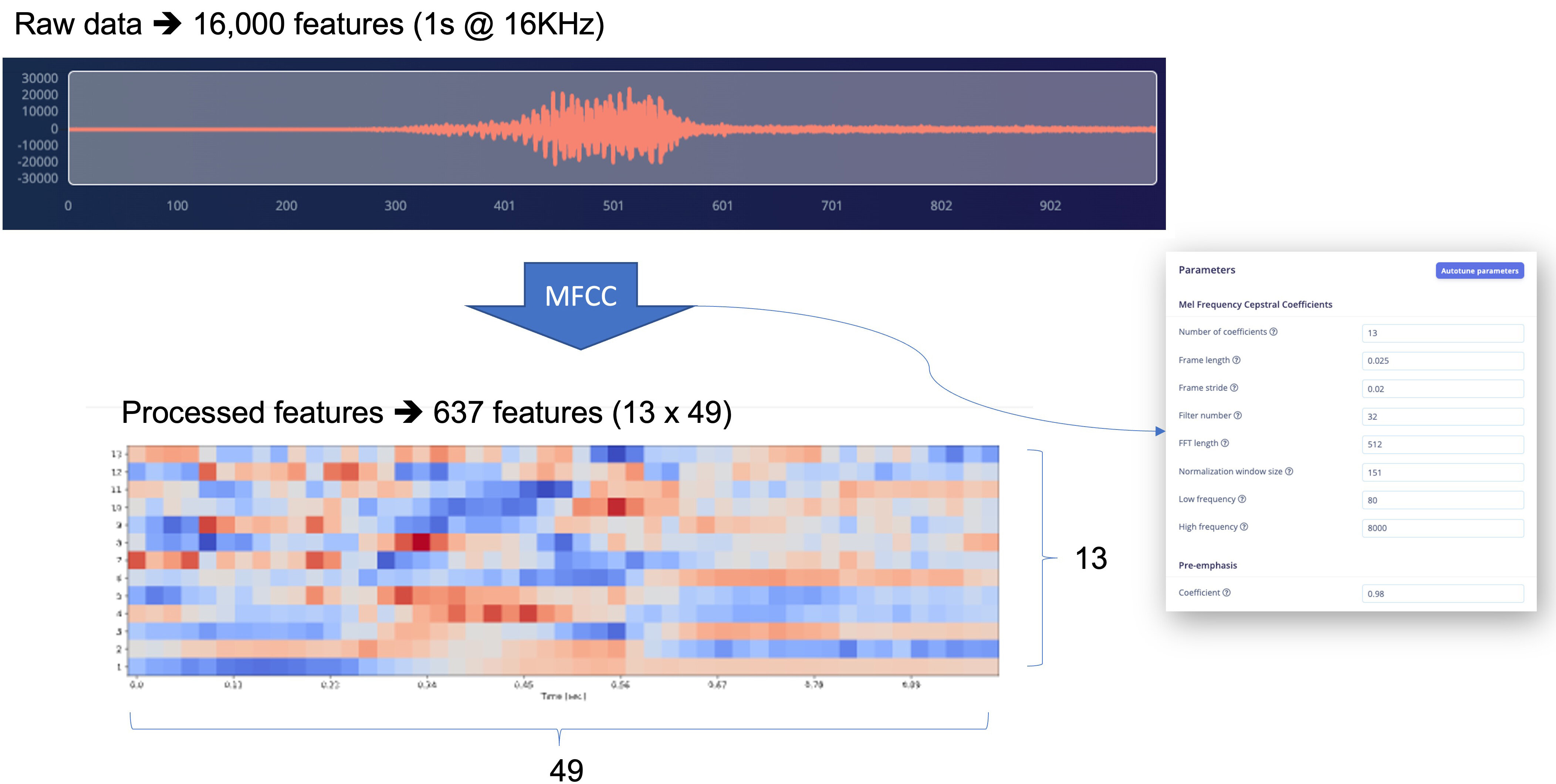 To understand better how the raw sound is preprocessed, look at the Feature Engineering for Audio Classification chapter. You can play with the MFCC features generation by downloading this notebook from GitHub or [Opening it In Colab]