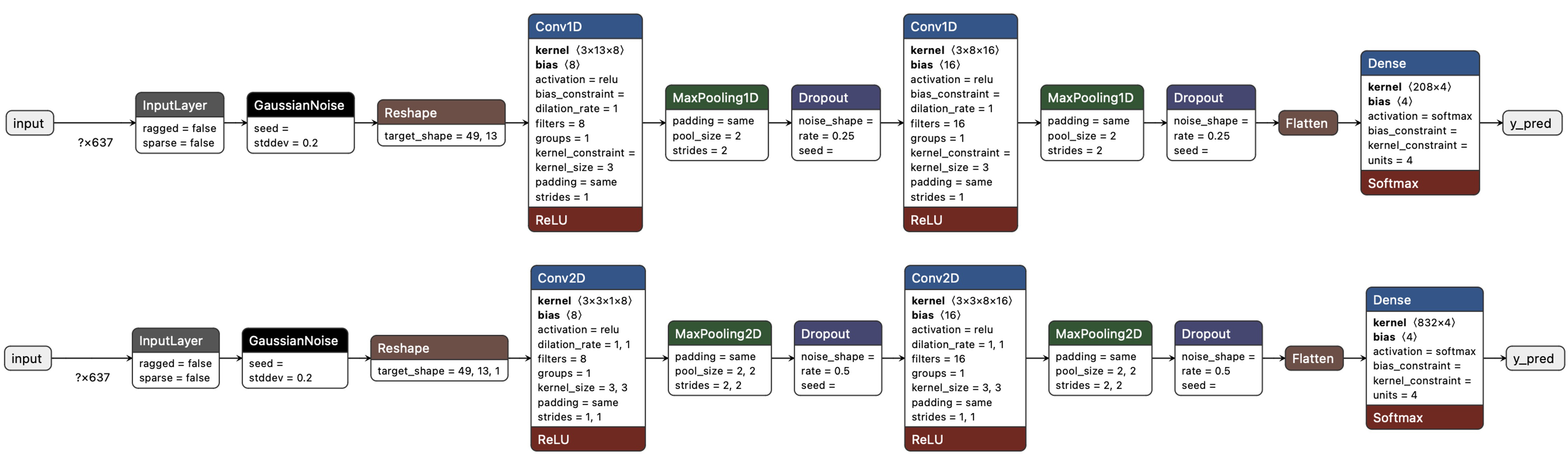 We will use a simple Convolution Neural Network (CNN) model, tested with 1D and 2D convolutions. The basic architecture has two blocks of Convolution + MaxPooling ([8] and [16] filters, respectively) and a Dropout of [0.25] for the 1D and [0.5] for the 2D. For the last layer, after Flattening, we have [4] neurons, one for each class: