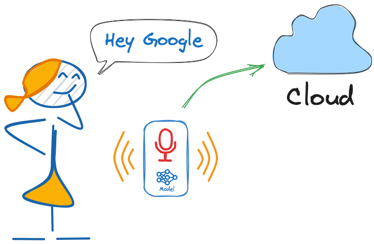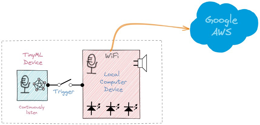 Stage 1: A small microprocessor inside the Echo Dot or Google Home continuously listens, waiting for the keyword to be spotted, using a TinyML model at the edge (KWS application).