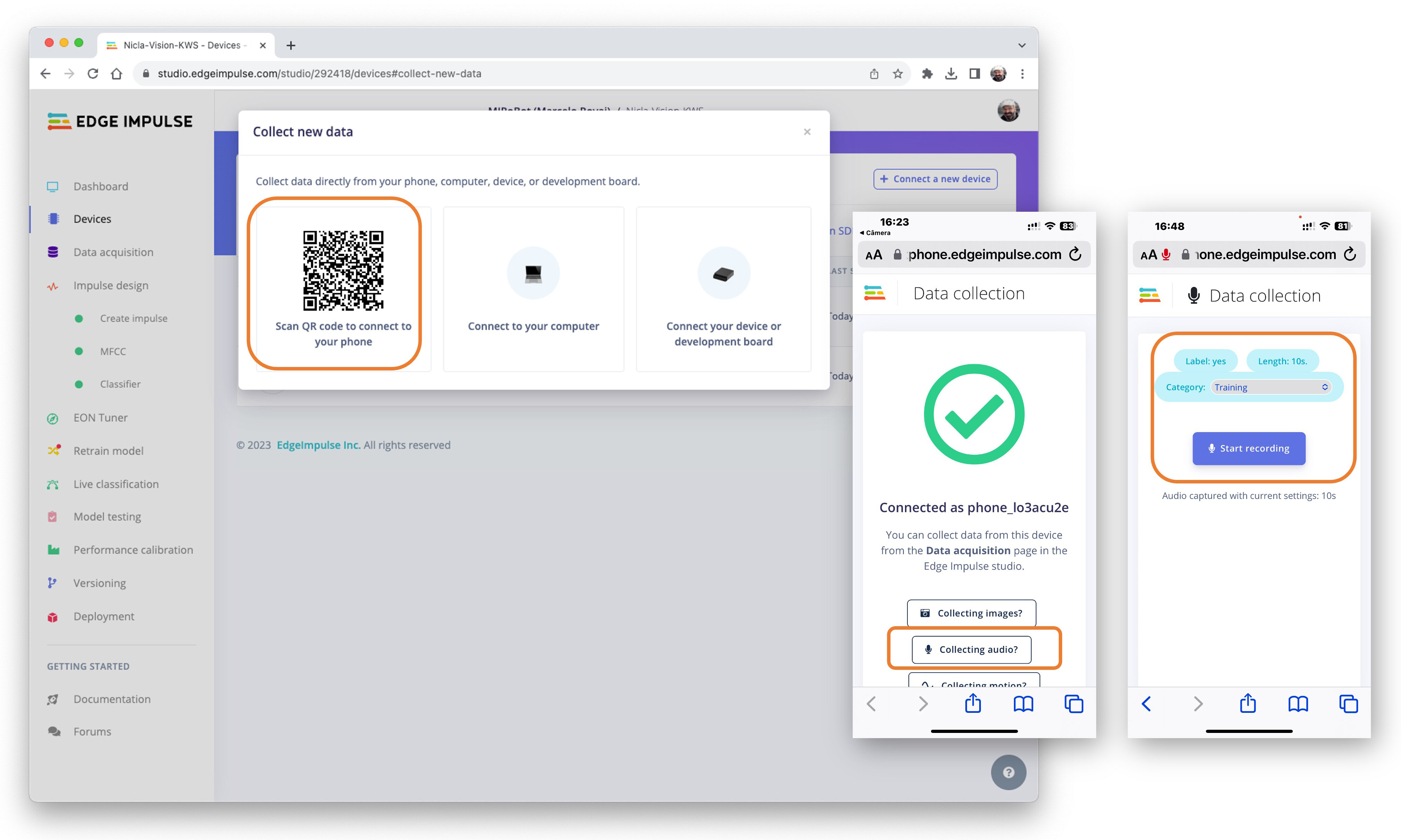 Go to Devices, scan the QR Code using your phone, and click on the link. A data Collection app will appear in your browser. Select Collecting Audio, and define your Label, data capture Length, and Category.