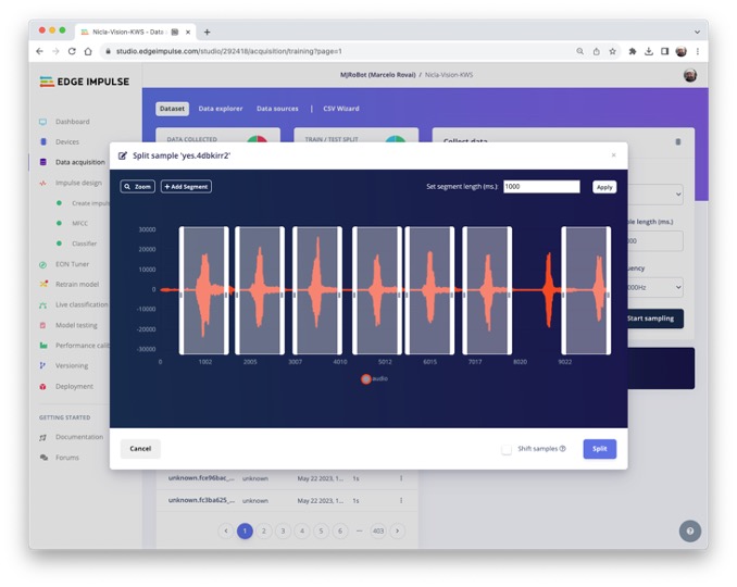 Although we have a lot of data from Pete’s dataset, collecting some words spoken by us is advised. When working with accelerometers, creating a dataset with data captured by the same type of sensor is essential. In the case of sound, this is optional because what we will classify is, in reality, audio data.