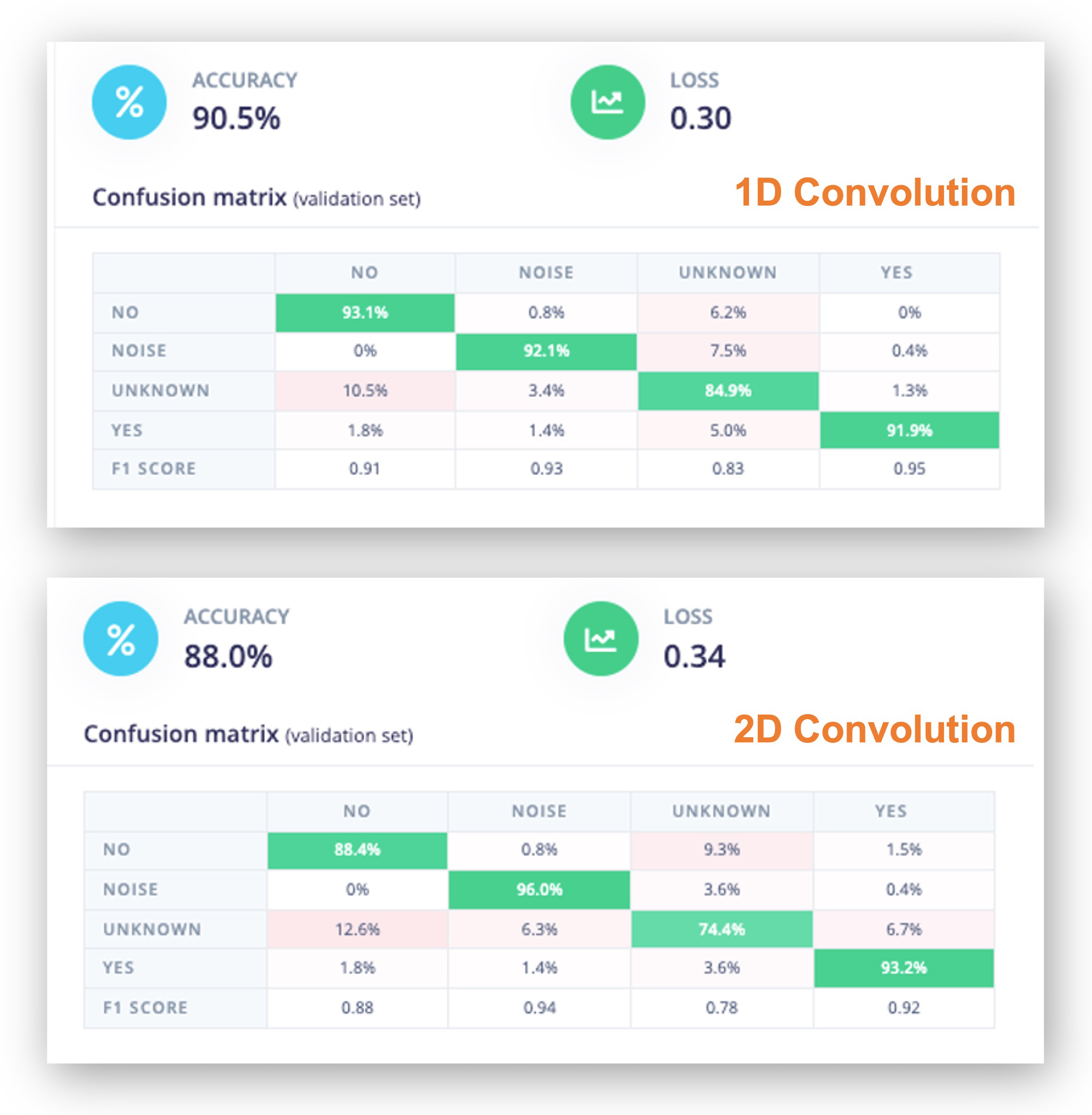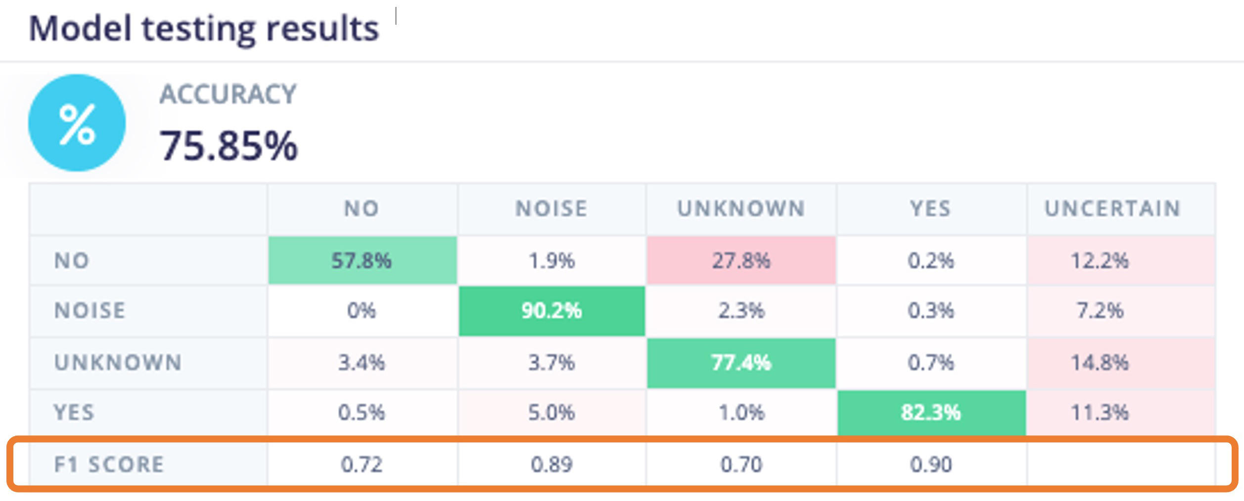 Inspecting the F1 score, we can see that for YES, we got 0.90, an excellent result since we expect to use this keyword as the primary “trigger” for our KWS project. The worst result (0.70) is for UNKNOWN, which is OK.